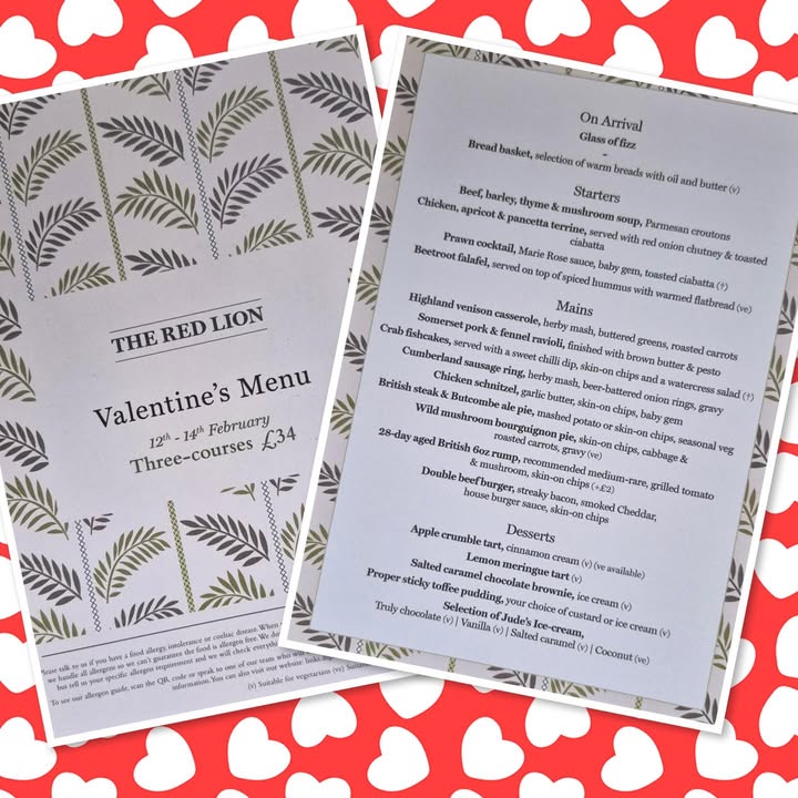 💘 Love Is on the Menu This February at The Red Lion in Bakewell ❤️🍽️✨ This Valentine’s Day, skip the stress and treat your special someone to a cozy, romantic evening at your favorite local pub here in the heart of our beautiful town. Want to really push the boat out? Book a room and make it a sleepover! 🥂 3-Course Valentine’s Meal 🔥 Delicious seasonal dishes 🍷 Perfect wine & cocktail pairings 🕯️ Cosy & warm atmosphere Whether it’s your first date or your fiftieth, we’ll make it a night to remember. ❤️ 📅 February 12th to 14th – Limited tables available! Book now to avoid disappointment! Tag your Valentine below and start planning your perfect night 💑🍷🍾 🥂 #valentines #heartsandflowers #loveisintheair #bakewell